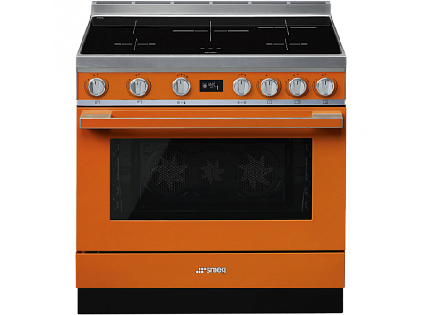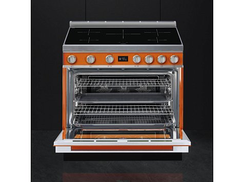 Варочный центр Smeg выполнен в оранжевом цвете. Удобные поворотные переключатели позволят точно и быстро настроить прибор, а на LCD-дисплее отображаются все процессы, которые происходят в камере. Данная модель предусматривает в себе 10 режимов нагрева, в числе которых «классический», «гриль» и 2 функции разморозки — по весу и по времени, с помощью которых можно разморозить десерты, овощи или готовую пищу. При работе программы пиролитической очистки, температура в духовом шкафу достигает 500 градусов Цельсия, благодаря чему, после ее окончания, достаточно смахнуть пыль, что делает уход за духовкой очень простым.